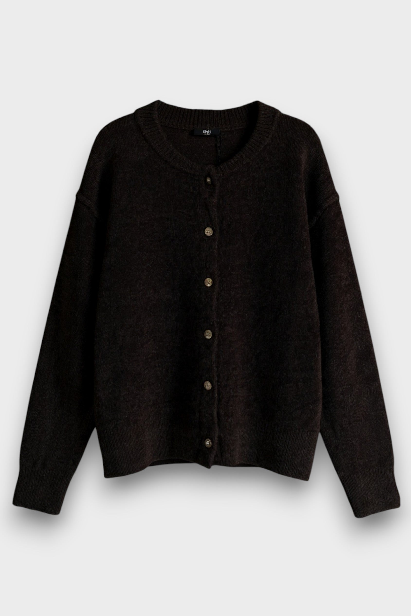 Casaco com decote redondo e manga comprida. Fecho frontal com botões.